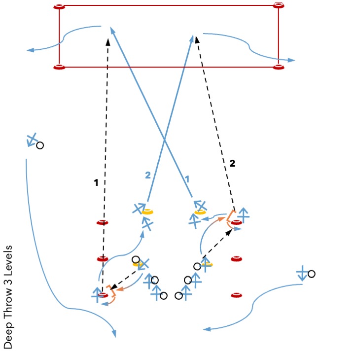 Variation: Jede:r Werfer:in wirft 3 (oder 4, oder 5) Würfe hintereinander, bevor sie/er wieder zum nächsten Posten geht. Marker:innen wechseln solange direkt zum Receiving Posten. Wenn die/der Werfer:in fertig ist, wechselt die nächste Person, die noch nicht geworfen hat zum Wurf Posten. So kann man nach einem Wurf direkt anpassen, was man verbessern möchte, ohne dass dabei eine ganze Runde vergeht bis zum nächsten Wurf.