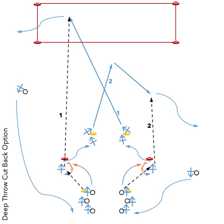 In diesem Beispiel wählt jede:r selber, ob sie/er den langen Pass oder den Pass auf den Cut Back spielt. Wie dass signalisiert wird, dass der lange Pass nicht gespielt wird, kann unterschiedlich geschehen (verbal, Fake...) und sollte auf die Strategie angepasst sein, die das Team auch im Spiel verfolgt.