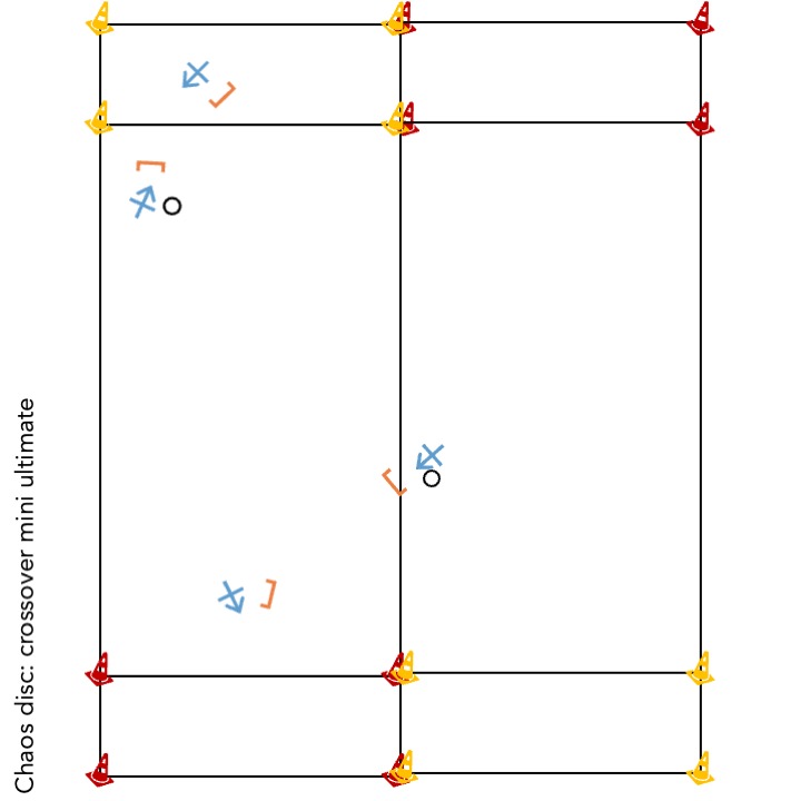 Zwei Mini Ultimate Spielfelder, ca. 15x6m, direkt nebeneinander (siehe Skizze). Es spielen also 4 Teams auf dem fast gleichen Spielfeld. Die Endzonen die zum gleichen Spielfeld gehören, sind versetzt, so dass beide Spiele diagonal stattfinden und sich überkreuzen.