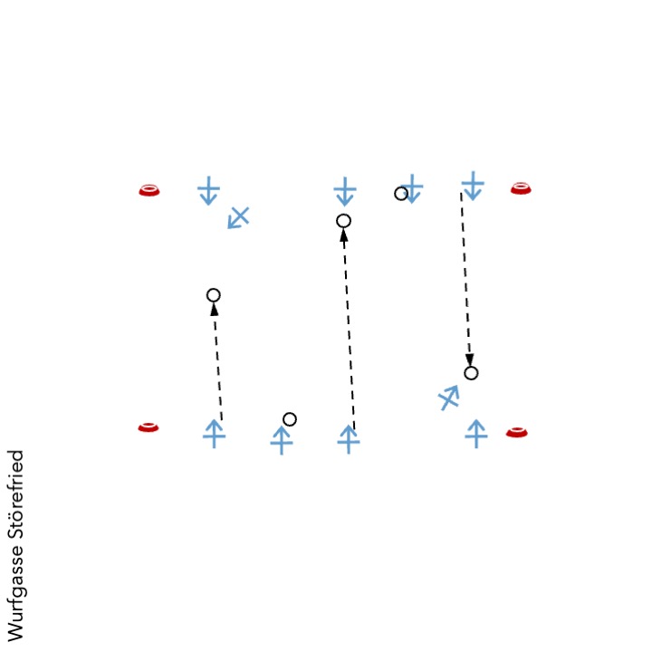 - Störefried (siehe Bild 2): Man darf seine Nachbarn links und rechts jeweils so stören, dass man sie bei Fangen ablenkt. Das kann mit Geräuschen oder anderen Mitteln sein. Man darf auch "so tun als ob" man die kommende Scheibe berührt oder fängt. Dabei darf man aber die Scheibe der anderen nie berühren. Für diese Übung sollte man die Distanz auf 15-20m verlängern und etwas Tempo aus der Übung nehmen.